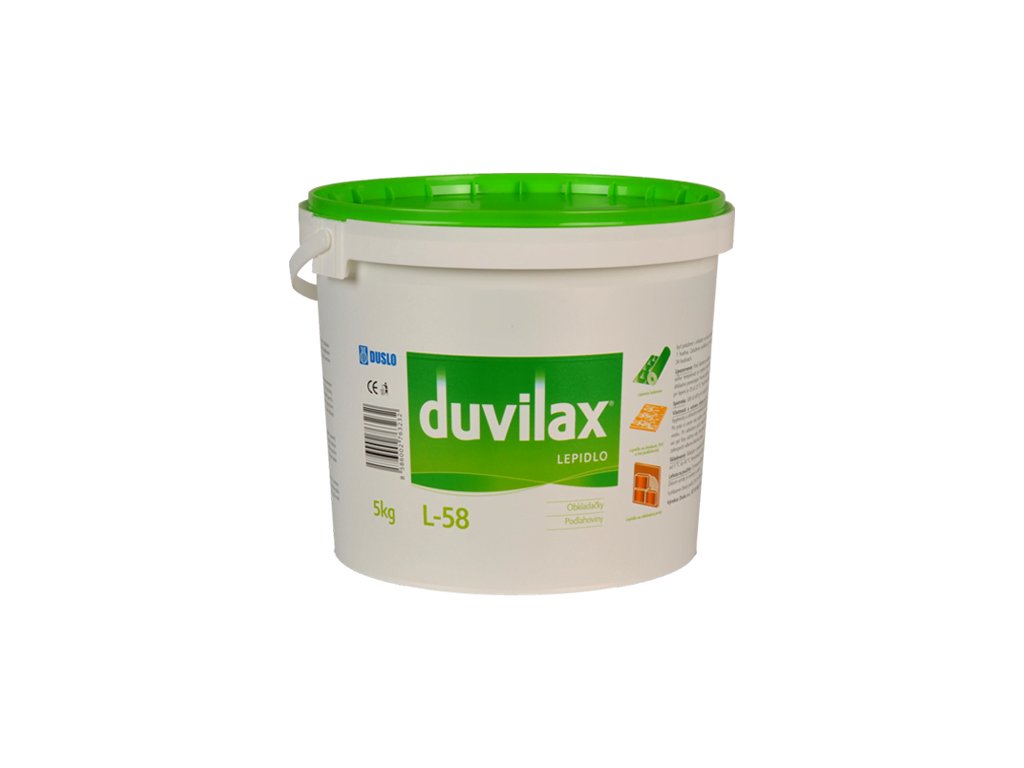 Univerzální stavební lepidlo. Duvilax L - 58 se používá neředěné na lepení textilních a PVC podlahovin, linolea, marmolea, koberců, plastových parapetů, vinylazbestové a mramorové dlažby, keramických a polystyrénových obkladů. U vedené materiály se mohou lepit na podklady z cementového potěru, na omítky, dřevovláknité a dřevotřískové desky, na anhydritové a sádrové vyrovnávací vrstvy apod.