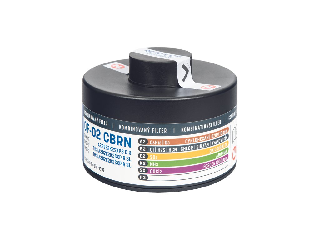 Ochranný filtr oF – 02 CBRn A2B2E2K2SXP3 D R Průměr x výška: 110 x 81mm Hmotnost: 3450g Dýchací odpor při: 30 l/min - 160 Pa, 95 l/min - 600 Pa Koeficient průniku: 99,99% Závitové připojení: EN 148-1 Rd 40x1/7”Doplňkové parametry
