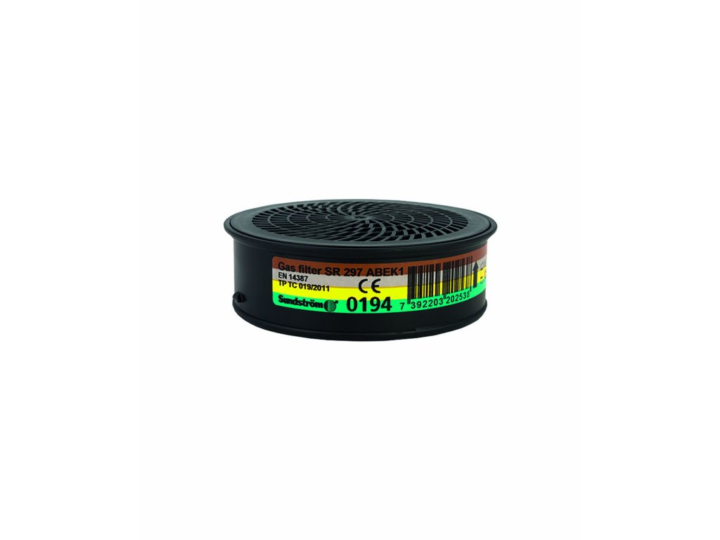 Protiplynový filtr ABEK1 pro použití se všemi polomaskami a celoobličejovými maskami Sundström. Filtr ABEK poskytuje ochranu proti těmto typům plynů a výparů: Typ A chrání vůči organickým plynům a výparům jako jsou rozpouštědla, s bodem varu >+65°C. Typ B chrání vůči anorganickým plynům a výparům jako jsou chlór, sirovodík nebo kyanovodík. Typ E chrání vůči kyselými plyny a výpary, jako jsou oxid siřičitý a fluorovodík. Typ K chrání vůči amoniaku a některým aminům jako je ethylen diamin. Plynový filtr lze snadno kombinovat s částicovým filtrem SR 510 P3 R, aby byla zajištěna ochrana vůči aerosolům (částicím), například při lakování.Doplňkové parametry