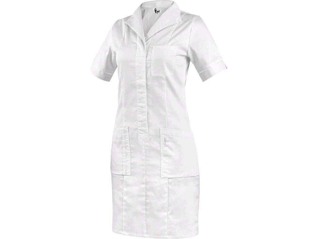 Dámské šaty s krátkým rukávem, vpředu i vzadu tvarovány princesovým švem, u krku pohodlná rozhalenka, délka ke kolenům, kryté zapínání na baby druky, náprsní kapsa vlevo, 2 spodní kapsy nakládané kapsy s volným spodním okrajem. Doporučené použití: w
