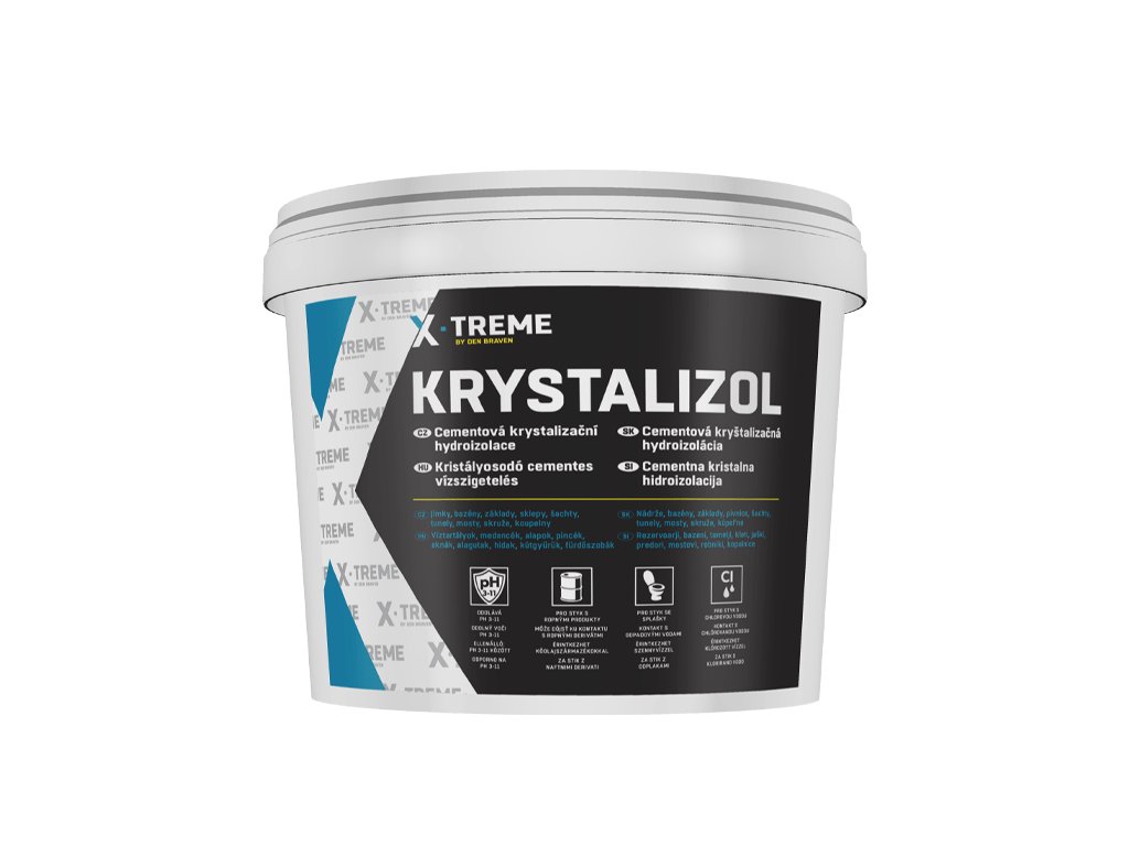 Je vodotěsný systém, který zamezuje pronikání vody do betonu nebo jiných cementových podkladů vystavených stálému působení tlaku vody. Zaručuje zvýšení nepropustnosti betonů a malt proti vodě, kyselinám a ropným produktům, zabraňuje korozi betonu a současně tvoří na povrchu vodotěsnou vrstvu. Na ošetřený povrch krystalizolem lze nanášet jakékoliv nátěry a omítky.