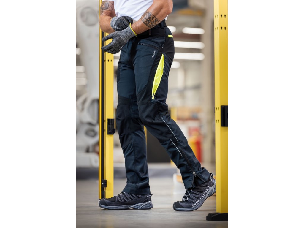 Montérkové kalhoty do pasu se strečovými vsadkami jsou navrženy pro maximální komfort a dlouhou životnost. Kombinace moderních materiálů zajišťuje vynikající pevnost, pružnost a odolnost i v náročných podmínkách. Kalhoty jsou vyrobeny ze speciální tkaniny se zesílenými panely Cordura® pro maximální ochranu namáhaných částí proti oděru. Anatomický 3D Silhouette COMFORT FIT střih umožňuje volnost pohybu, ergonomicky navržené linie zajišťují pohodlné nošení a boční ventilační zipy se síťovinou pomáhají s odvodem tepla. Elastický pas poskytuje pohodlné přizpůsobení obvodu pasu. Kalhoty jsou vybaveny rivety pro vyšší životnost a kovovým D-kroužkem pro uchycení předmětů. Prakticky řešené kapsy zahrnují 2 hluboké průhmatové kapsy, 2 zipové kapsy na mobil a drobnosti a dvě multifunkční zipové kapsy na zadní straně kalhot. Pro zvýšení bezpečnosti jsou kalhoty opatřeny dynamickými reflexními prvky, které zajišťují lepší viditelnost při práci ve zhoršených světelných podmínkách. Spodní lem nohavic je doplněn o zipy, které umožňují rozšíření obvodu nohavic pro snadné přetažení kalhot přes širší obuv a jsou opatřeny skrytými kovovými háčky, aby kalhoty perfektně držely na svém místě. Kalhoty jsou kompatibilní s přídavnými vyztuženými nářaďovými kapsami, které jsou určeny k nasazení na opasek pomocí suchých zipů. Sadu přídavných nářaďových kapes, která doplňuje kolekci, je možné objednat samostatně pod objednávkovým číslem H6260.