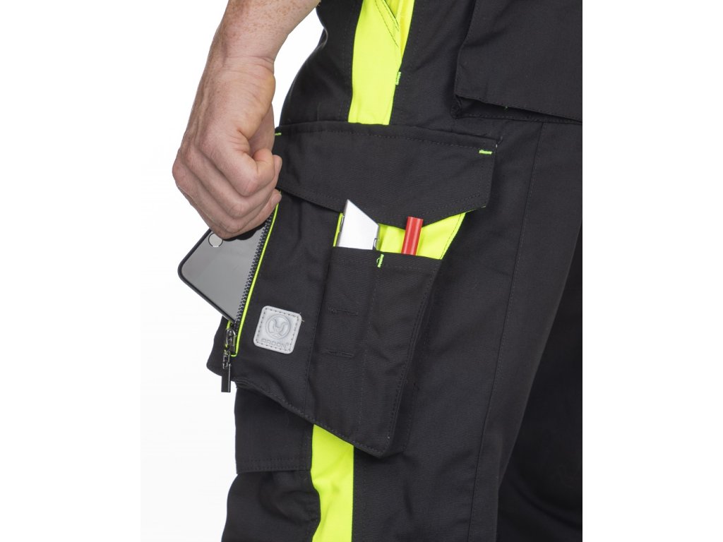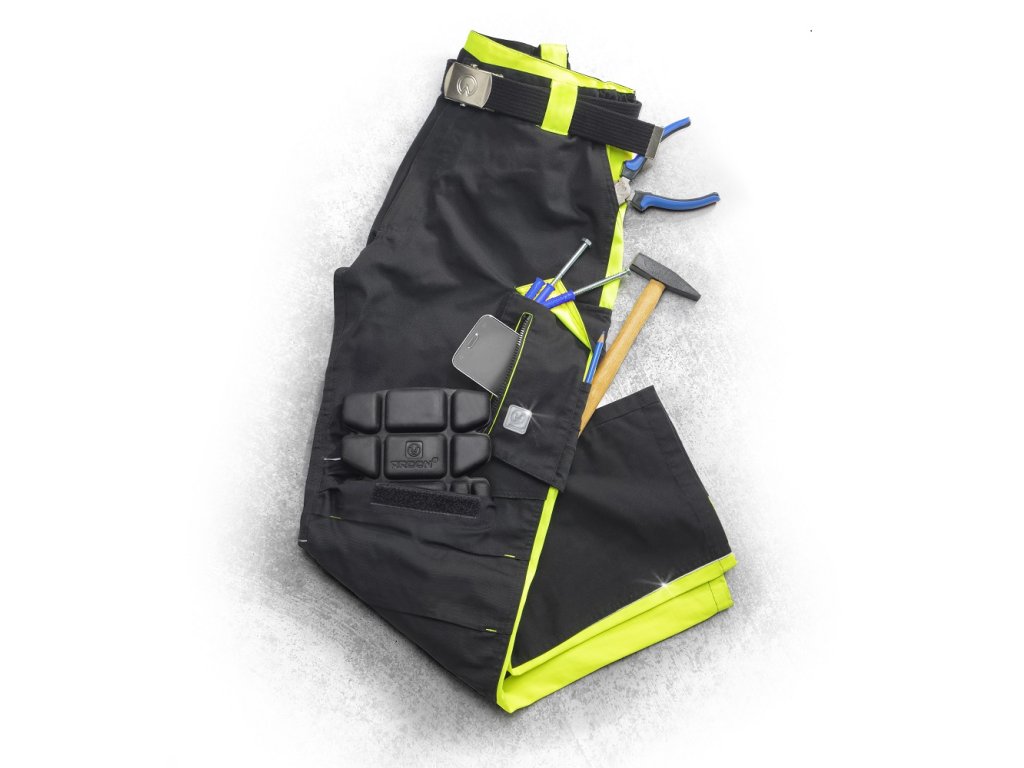 - 2 přední průhmatové kapsy, 2 zadní kapsy kryté patkami, velká průhmatová kapsa na levé nohavici krytá patkou, 1 zipová kapsa na mobil do velikosti 5,6“, kapsa na odlamovací nůž, šroubovák a tesařské tužky, na pravé nohavici kapsa na skládací metr, šroubovák a odlamovací nůž