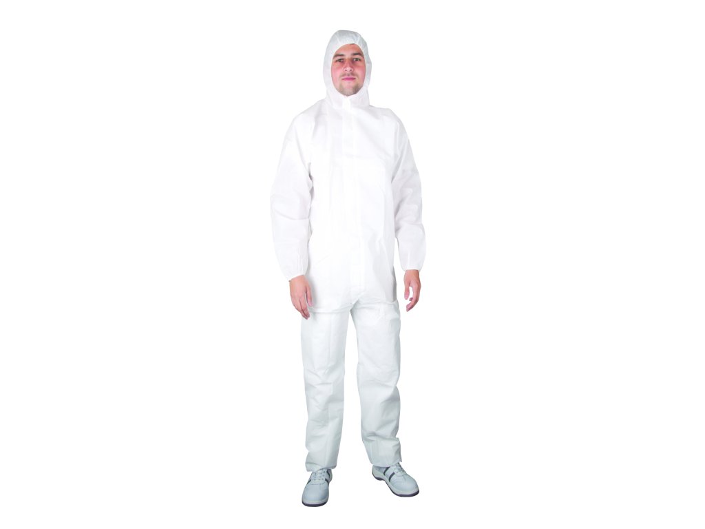 - bílý jednorázový ochranný overal s elastickou kapucí