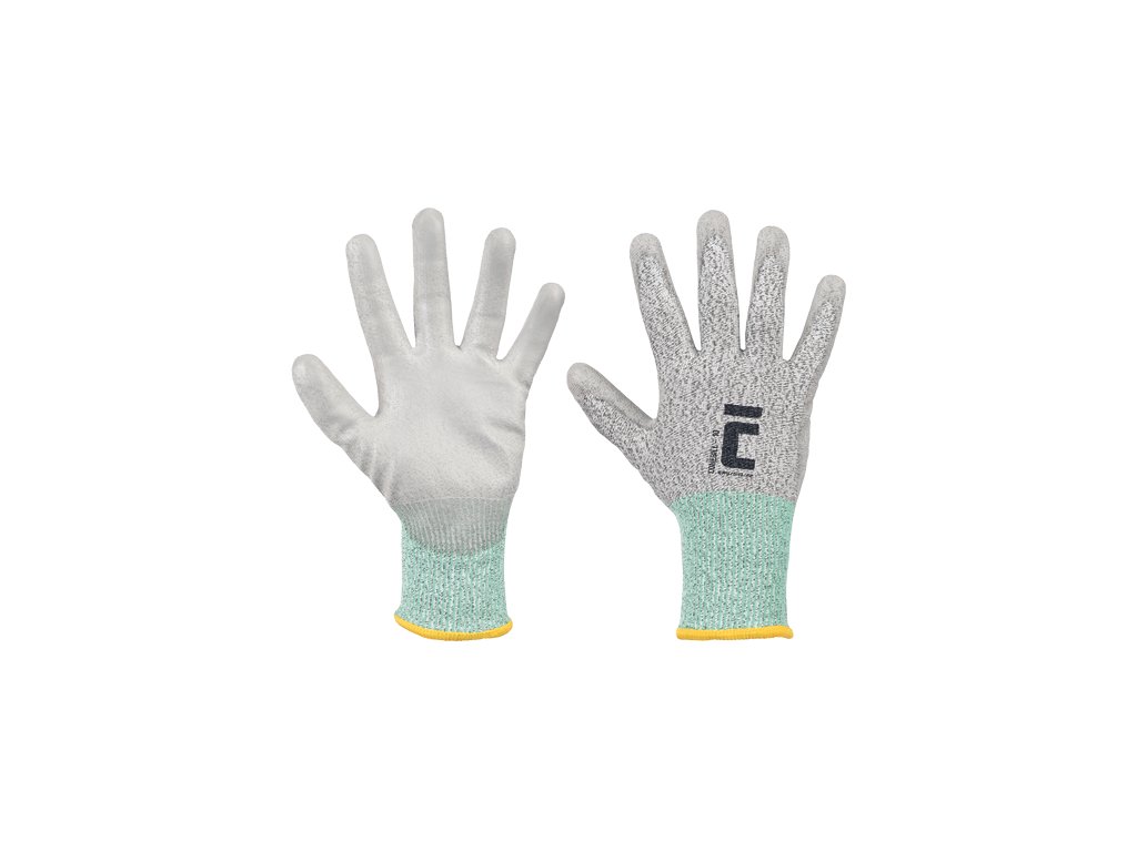 • pletené bezešvé rukavice • kategorie prořezu C • šedý PU na dlani a prstech