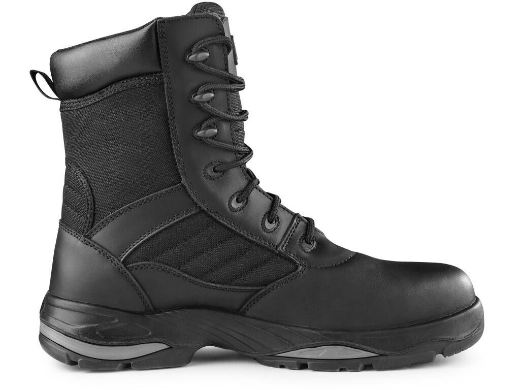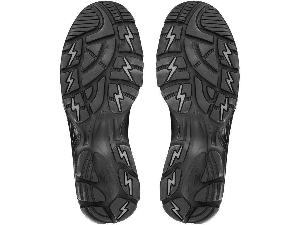 Poloholeňová pracovní obuv, kombinovaná. Materiál: svršek z 1,6–1,8 mm hovězí lícové kůže a hydrofobní textilie Oxford, podšívka z prodyšné mesh textilie, vyjímatelná stélka z polyuretanové pěny. Podešev: PU-guma, protiskluzová, antistatická, odolnáDoplňkové parametry