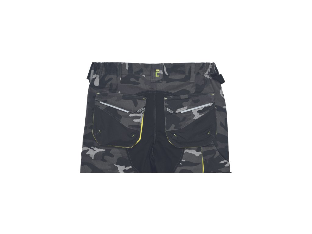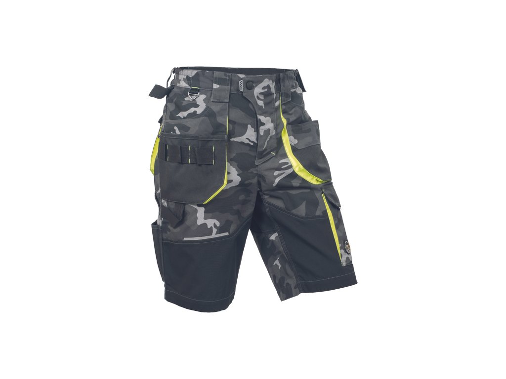 pánské pracovní šortky s pružným pasem a multifunkčními kapsami; v moderní úpravě šedé kamuflážové barvy; Oxford 600D zesílené spodní částí kapes; odolné trojité prošití nohavic a sedu; reflexní prvky