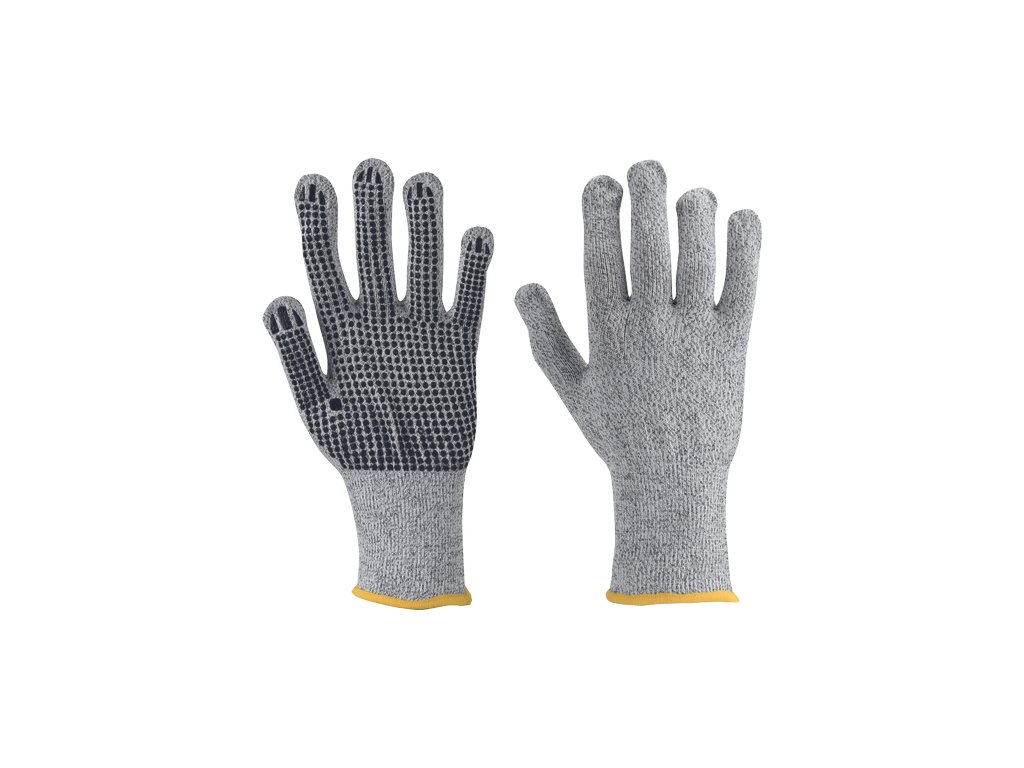 Pletené bezešvé rukavice z modifikovaného skleněného vlákna, Spandexu a nylonu, s PVC terčíky v dlani a na prstech a odolností proti prořezu kategorie C.Doplňkové parametry