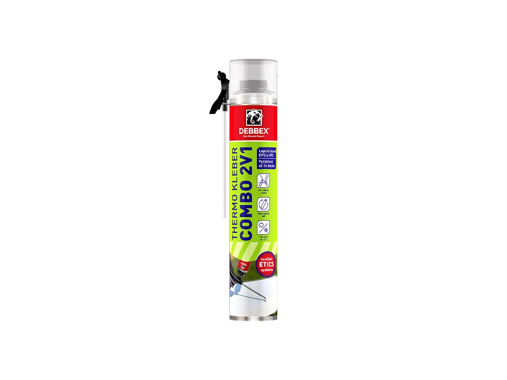THERMO KLEBER COMBO 2v1 je nízkoexpanzní pěna pro lepení EPS a XPS desek, kterou lze aplikovat pistolí i trubičkou. Nabízí polohovatelnost 360° při aplikaci, výbornou zvukovou a tepelnou izolaci a výtěžnost až 14 desek. Je součástí ETICS systému, použitelná celoročně do -5 °C. Ideální pro lepení a montáž na svislé konstrukce.